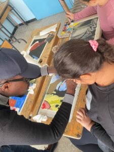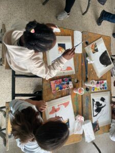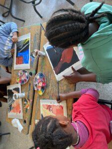 Chaque jour, l’artiste Ngoy Clovis M. anime deux ateliers d’une heure avec une douzaine d’élèves : chacun peint un fragment d’un portrait collectif consacré à une grande figure du jazz liée au Festival Marseille Jazz des cinq continents.